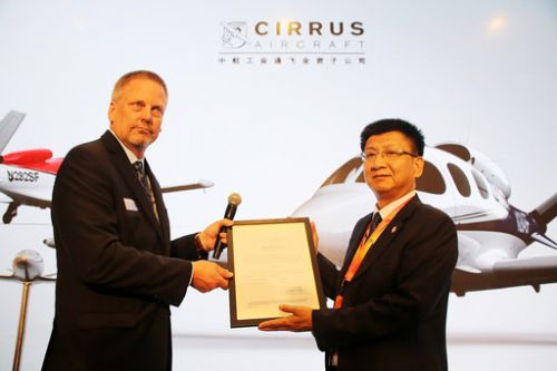 2016年11月2日,西锐公司联合创始人兼首席执行官戴尔向中航工业通飞董事长曲景文递交FAA证书。